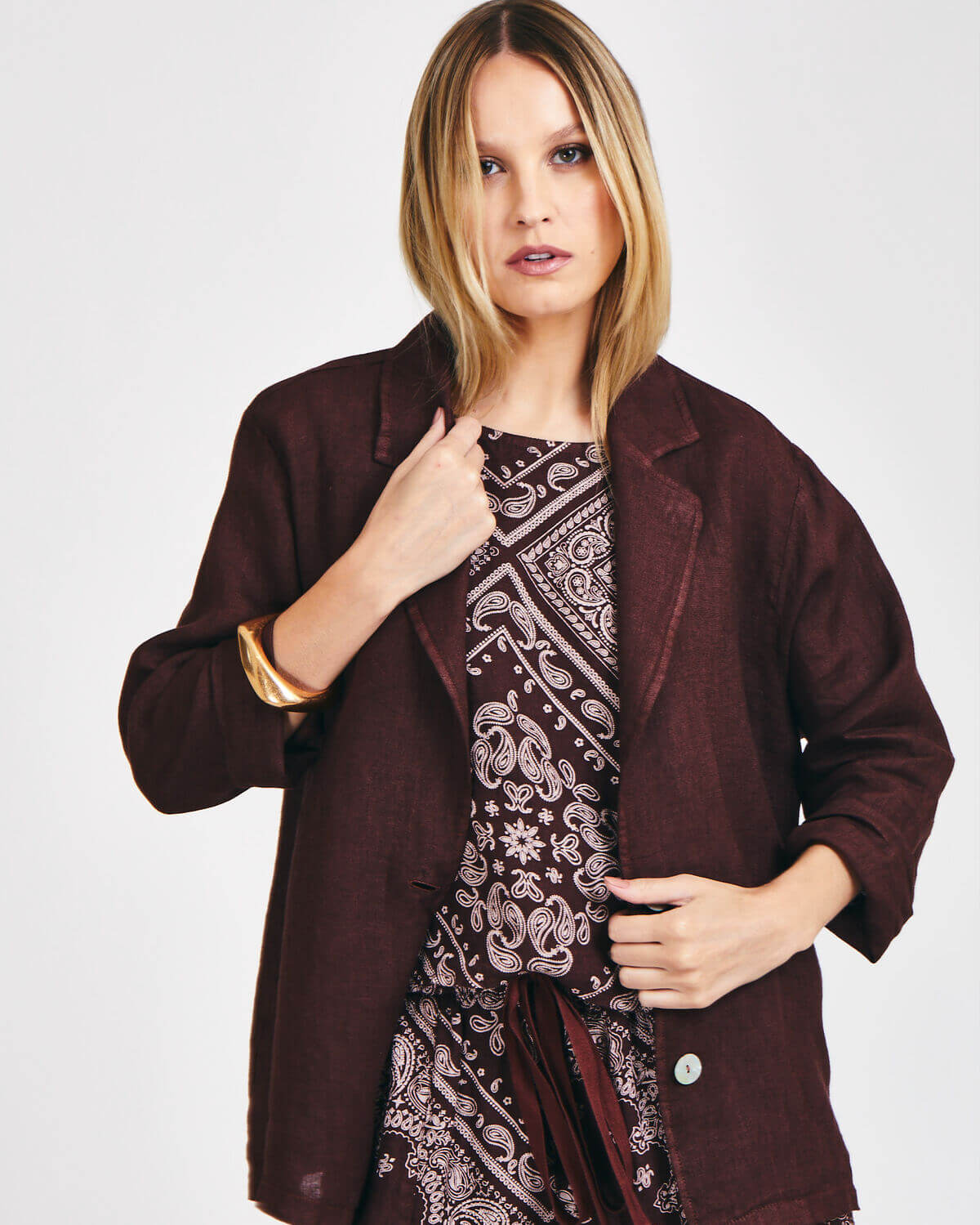 Blazer Ravello em linho de modelagem leve e sofisticada. Versátil, elegante e perfeito para composições modernas com conforto e estilo.